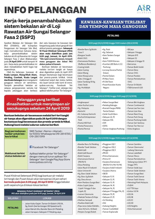 “Antaranya adalah memberikan bantuan bekalan air melalui tangki lori air, tangki statik, pili awam, stesen pengisian air setempat dan agihan botol air minuman, selain memastikan bantuan bekalan air dibekalkan ke premis kritikal seperti hospital, pusat dialisis dan sebagainya,” katanya.