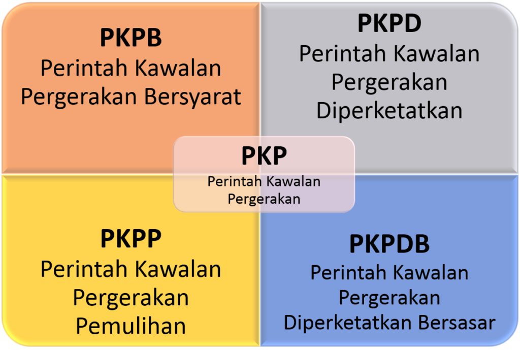 PKPB: Kawalan pergerakan yang lebih longgar daripada PKPD dan PKP dengan mengehadkan perhimpunan di majlis, acara atau aktiviti sosial, manakala sektor ekonomi masih dibenarkan beroperasi seperti biasa dengan mematuhi prosedur standard operasi (SOP) ditetapkan. Masa operasi perniagaan juga dihadkan dan ada campur tangan pihak berkuasa seperti sekatan jalan raya, dan pemantauan premis ke premis.