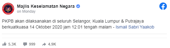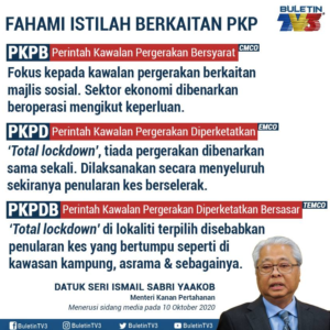 Menteri Kanan (Keselamatan) Datuk Seri Ismail Sabri telah mengumumkan pelaksanaan Perintah Kawalan Pergerakan Bersyarat (PKPB) di Selangor, Putrajaya dan Kuala Lumpur bermula 14 hingga 27 Oktober 2020.