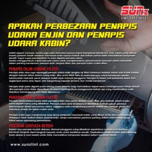 Kedua,pihak Sunz Tint memperkenalkan penapis kabin ( cabin filter). Penapis udara kedua kereta ialah penapis kabin atau selalu disebut “cabin filter” , dan terletak dalam kabin, sama seperti nama yang diberikan. Penapis udara ini biasanya diletakkan bawah papan pemuka berhampiran sistem penyaman udara. Tugasnya ialah menghalang kotoran, habuk dan alergen daripada masuk ke dalam kabin anda.