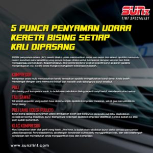 Jadi pihak Sunz Tint tidak mahu ada antara kita terlibat dengan hal ini dan pihak kami mahu pembaca- pembaca artikel ini sedar akan kepentingan tentang penyaman udara dek kata pepatah sediakan payung sebelum hujan. Kereta adalah perkara kedua kita yang menjamin keselesaan dan kesihatan kita untuk ke mana- mana.
